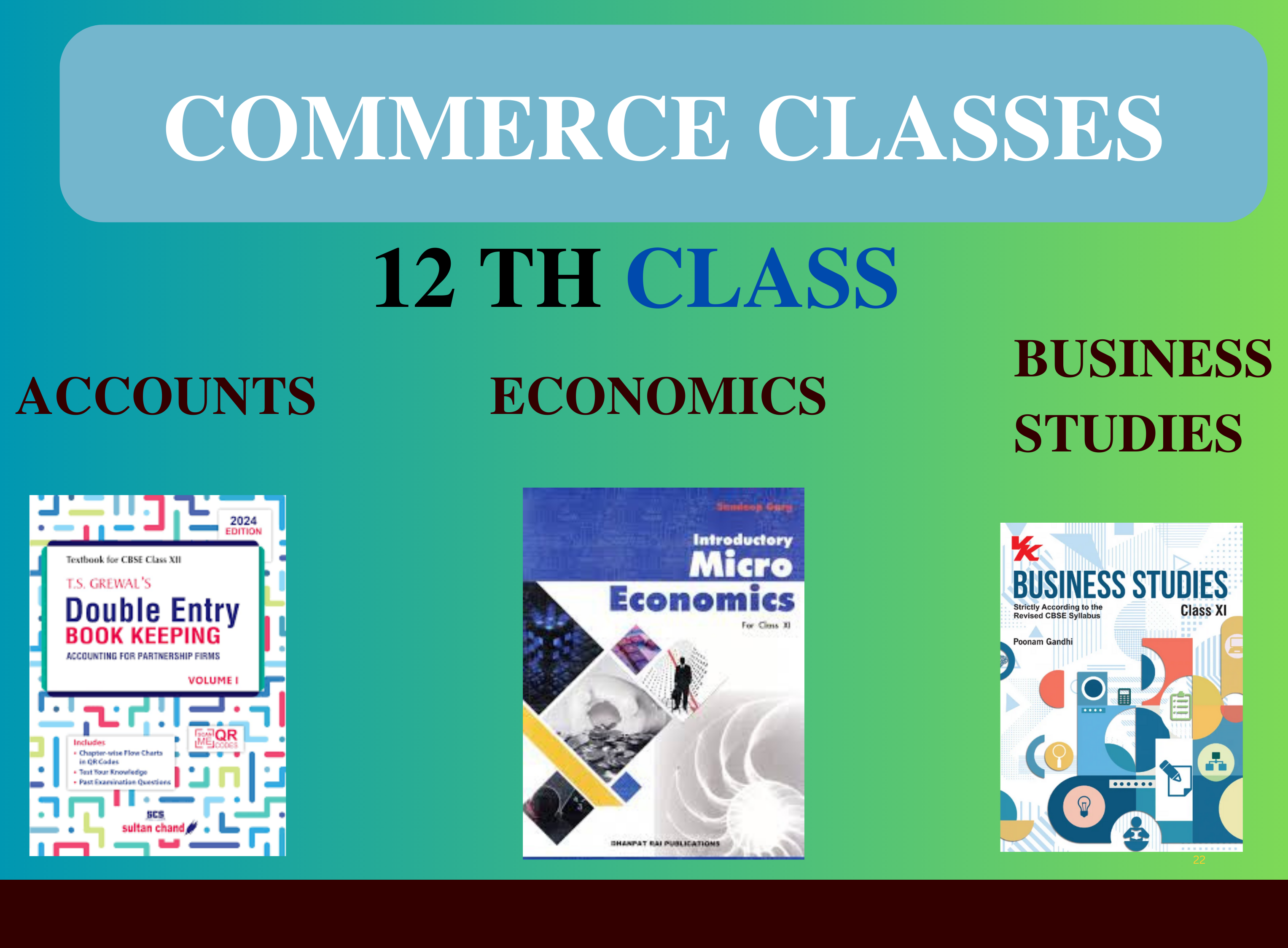 This course is designed for 12th commerce students to build a strong foundation in Accounting, Economics, and Business Studies. It covers concepts, theories, and practical applications to help students excel in their board exams and future careers.