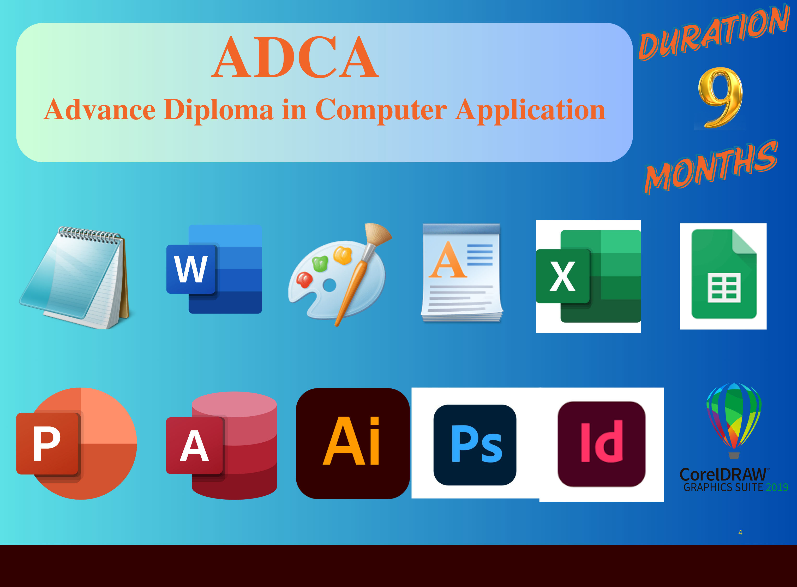 ADCA (Advanced Diploma in Computer Applications) is a professional course that covers essential computer skills, programming, and office tools. It prepares students for roles in IT and administrative fields.